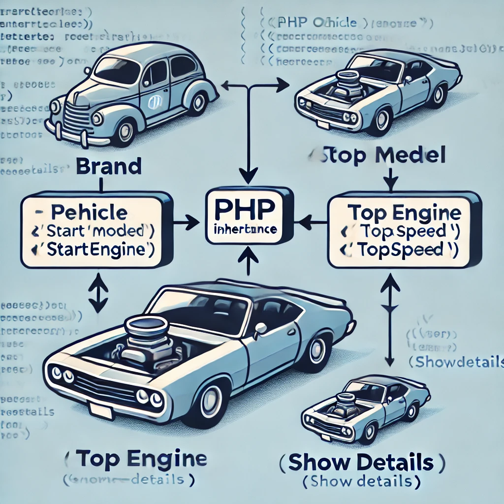 Car): The class that inherits from the parent class. parent::__construct(): The child class can call the parent class’s constructor using theparentkeyword.- Inheritance of Methods and Properties: The child class inherits all non-private properties and methods from the parent class.