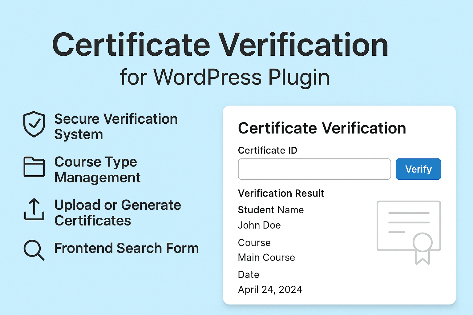 The Certificate Verification for WordPress Plugin is a powerful and easy-to-use tool designed for educational institutions, training centers, and online course providers. It enables administrators to issue unique certificates and allows users to verify the authenticity of those certificates directly from your WordPress website.
